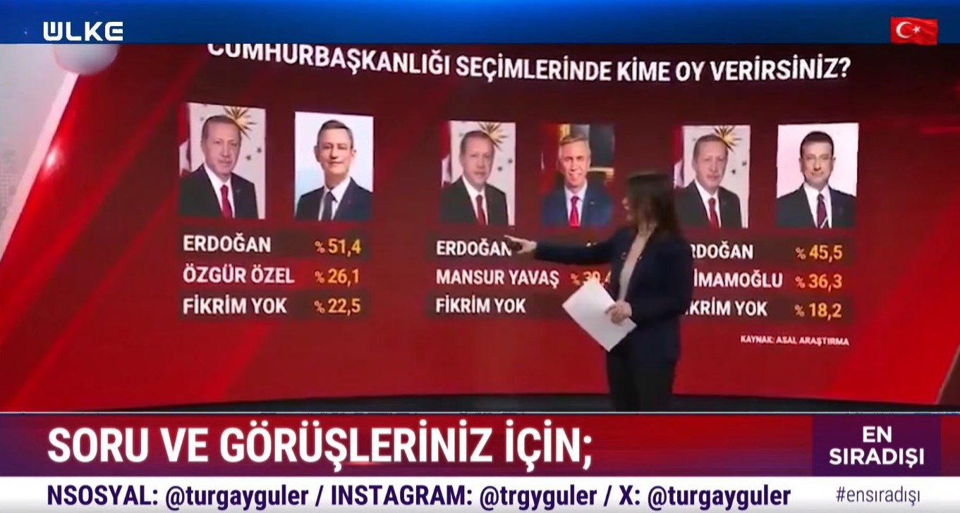 Gazeteci-yazar Turgay Güler'in sunumu, Sabah Gazetesi Yazarı Mahmut Övür, Haber 7 Yazarı Gaffar Yakınca ve Ülke TV Genel Yayın Yönetmeni Hasan Öztürk'ün yorumlarıyla ekrana gelen "En Sıradışı" programında muhalefete yakınlığıyla bilinen Sözcü TV’nin paylaştığı çarpıcı anket paylaşıldı.