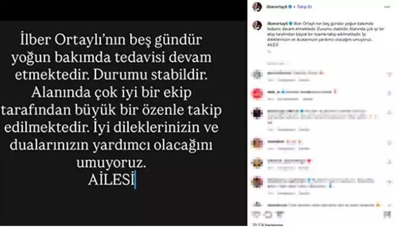 Sosyal medya paylaşımında "İlber Ortaylı’nın 5 gündür yoğun bakımda tedavisi devam etmektedir. Durumu stabildir. Alanında çok iyi bir ekip tarafından büyük bir özenle takip edilmektedir. İyi dileklerinizin ve dualarınızın yardımcı olacağını umuyoruz." denildi.
