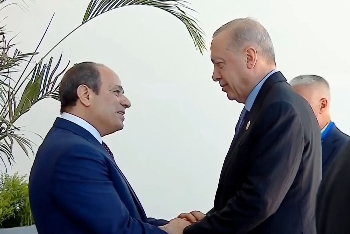 Daha sonra zirvenin yapılacağı alana giden Cumhurbaşkanı Erdoğan, burada Mısır Cumhurbaşkanı Abdulfettah es-Sisi tarafından karşılandı.