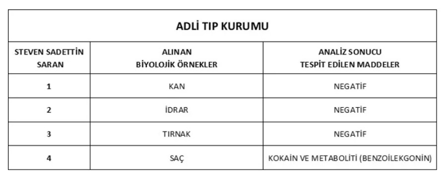 Saran'ın saç örneğinde yapılan incelemede 'kokain pozitif' olduğu belirlendi.