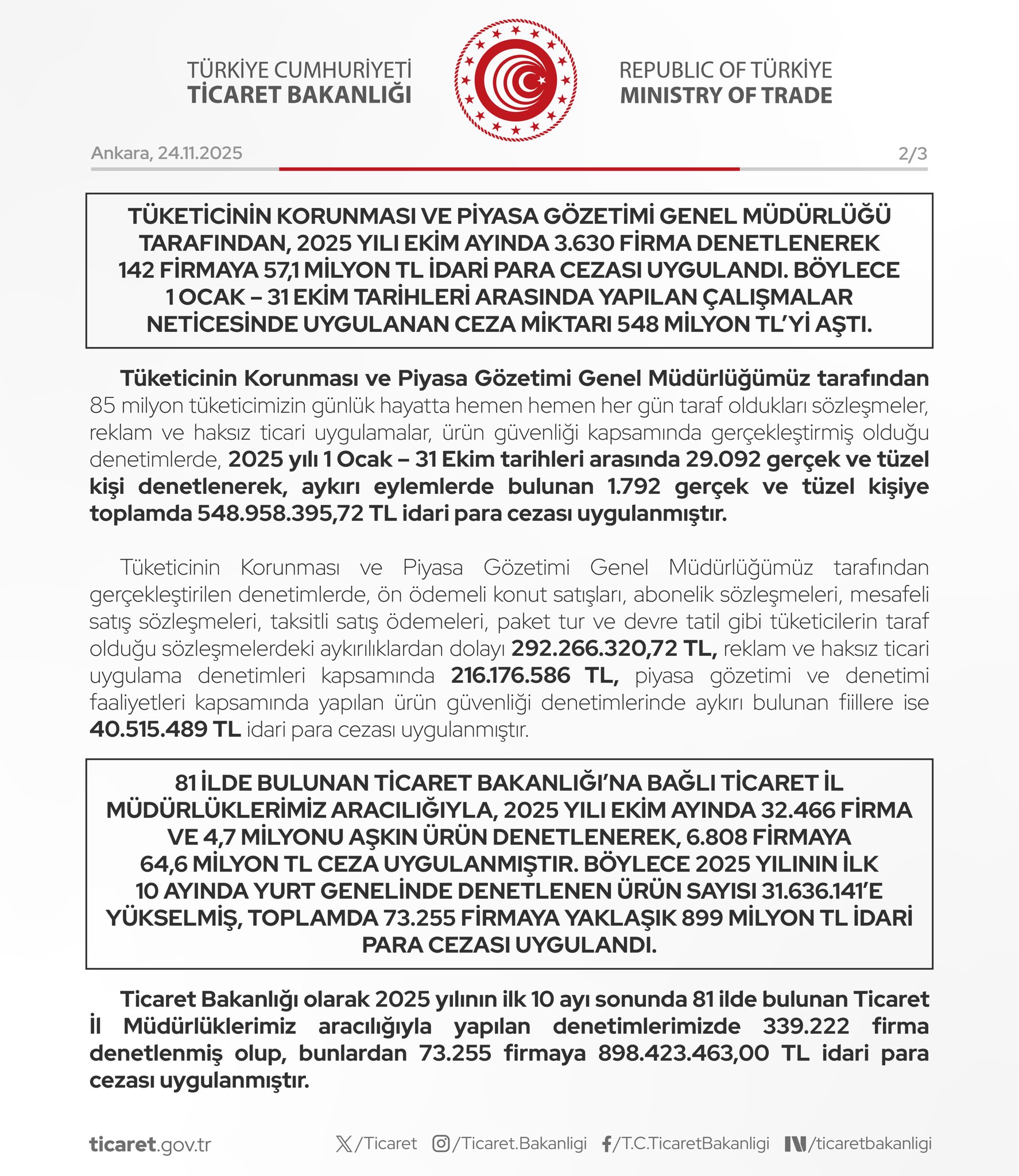 Rekabet Kurumu tarafından yürütülen incelemeler çerçevesinde ise geçen yıl 223 firmaya 7,7 milyar lira idari para cezası uygulandığı hatırlatılan açıklamada, "2025 yılının 10 ayında başta gıda endüstrisi, sigorta hizmetleri, finans işlemleri, inşaat ve kimyasal ürünler alanında hizmet gösteren 196 firmaya, 11 milyar 461 milyon 294 bin 34 lira idari para cezası uygulanmıştır. Bakanlık olarak öncelikli olarak enflasyon, fahiş fiyat, stokçuluk ve haksız ticari eylemlerle mücadele ederek iç piyasa dengesini sağlayıp, tüketicilerin huzur ve refahı için çalışmalarımızı titizlikle sürdürmeye devam edeceğiz." ifadeleri kullanıldı.