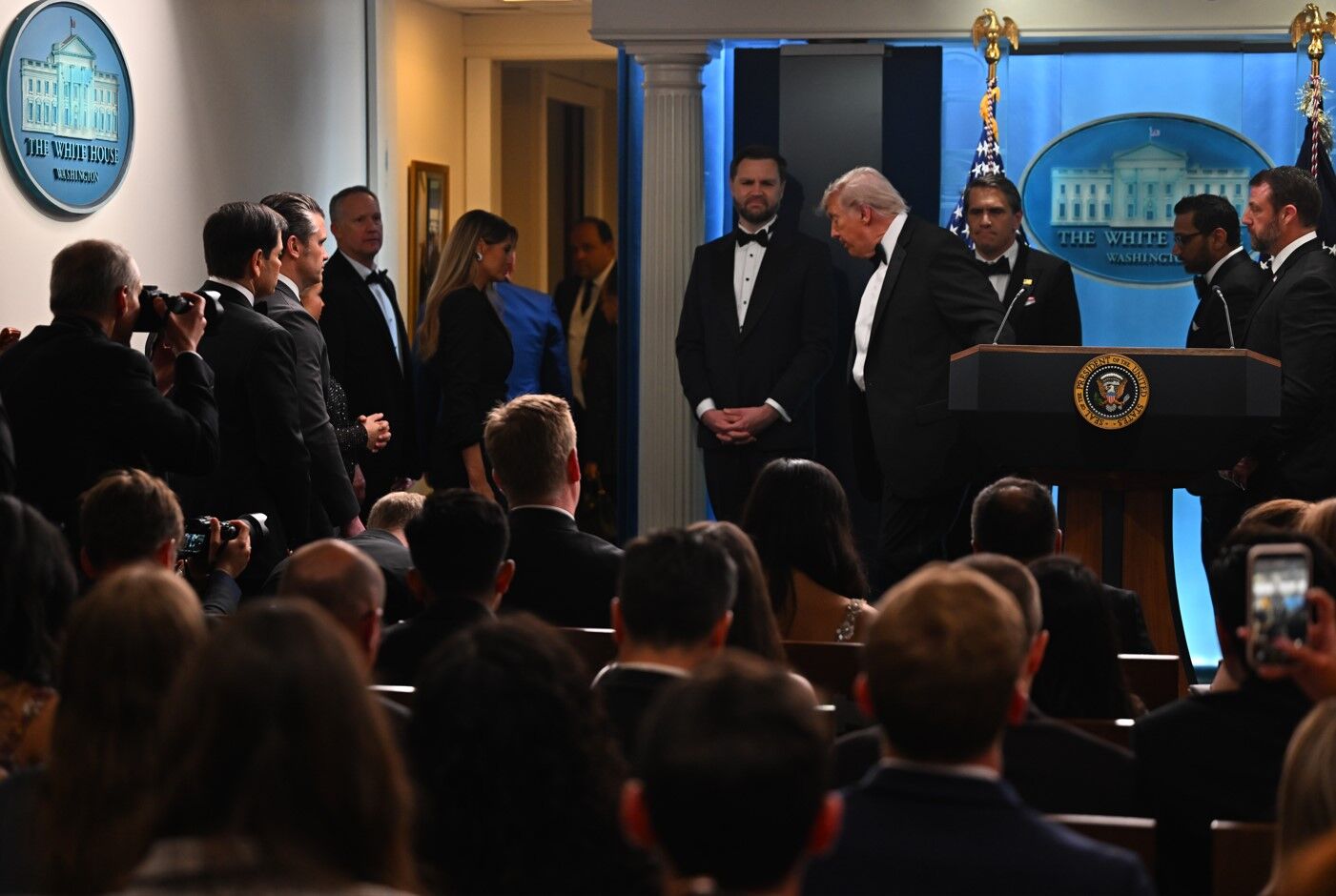 Başkan Trump ve First Lady Melania Trump, Dışişleri Bakanı Marco Rubio ve kabine üyeleri ajanların oluşturduğu koruma çemberiyle saniyeler içinde salondan uzaklaştırıldı.