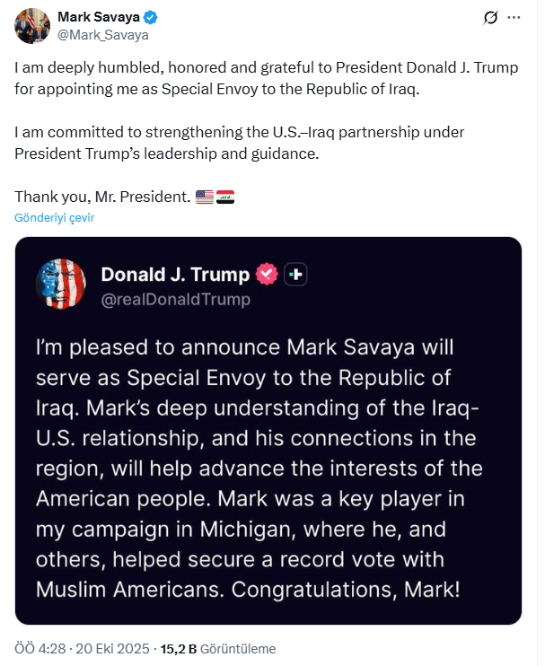 Başkan Trump, kendisine ait sosyal medya platformu Truth Social'dan yaptığı açıklamada, "Mark Savaya'nın Irak Cumhuriyeti Özel Elçisi olarak görev yapacağını duyurmaktan memnuniyet duyuyorum. Mark'ın Irak-ABD ilişkileri konusundaki derin anlayışı ve bölgedeki bağlantıları, Amerikan halkının çıkarlarını ilerletmeye yardımcı olacak. Mark, Michigan'daki kampanyamda kilit bir oyuncuydu; o ve diğerleri, Müslüman Amerikalılar arasında rekor oy alınmasına yardımcı oldular. Tebrikler, Mark" ifadelerini kullandı.