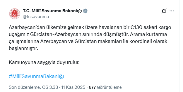 Açıklamada "Azerbaycan'dan ülkemize gelmek üzere havalanan C130 kargo uçağımız, Gürcistan'da düşmüştür. Arama kurtarma çalışmalarına Gürcistan makamlarıyla koordineli olarak başlanmıştır" denildi.