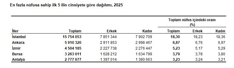 Türkiye nüfusunun %18,3'ünün ikamet ettiği İstanbul'u, 5 milyon 910 bin 320 kişi ile Ankara, 4 milyon 504 bin 185 kişi ile İzmir, 3 milyon 263 bin 11 kişi ile Bursa ve 2 milyon 777 bin 677 kişi ile Antalya izledi.