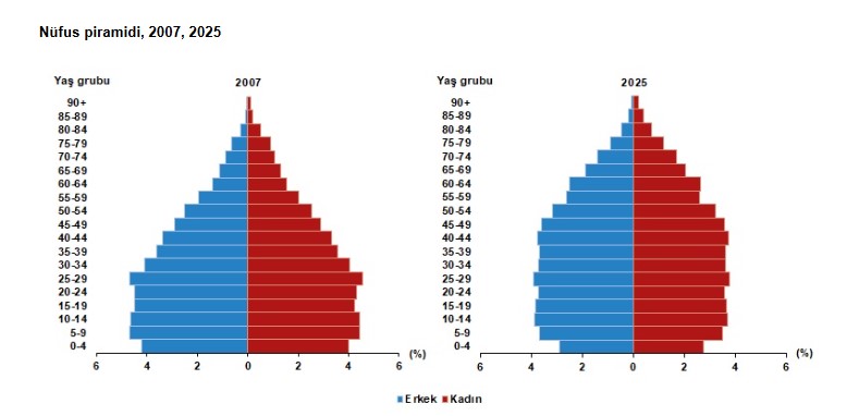 TÜİK verilerine göre; Türkiye'nin nüfusu, 2025'te bir önceki yıla göre 427 bin 224 kişi artarak 86 milyon 92 bin 168 oldu.
