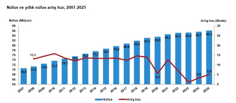 Yıllık nüfus artış hızı 2024 yılında binde 3,4 iken, 2025 yılında binde 5 oldu.