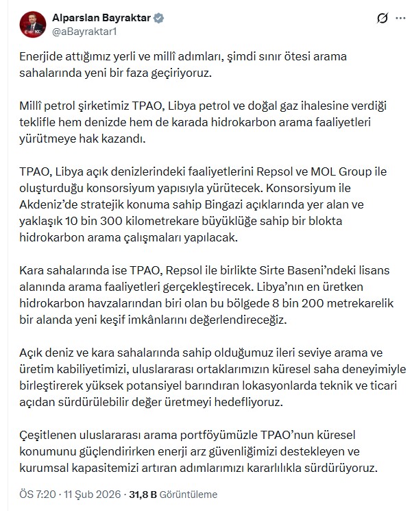 Paylaşımında Bayraktar, "Enerjide attığımız yerli ve milli adımları, şimdi sınır ötesi arama sahalarında yeni bir faza geçiriyoruz. Milli petrol şirketimiz TPAO, Libya petrol ve doğal gaz ihalesine verdiği teklifle hem denizde hem de karada hidrokarbon arama faaliyetleri yürütmeye hak kazandı. TPAO, Libya açık denizlerindeki faaliyetlerini Repsol ve MOL Group ile oluşturduğu konsorsiyum yapısıyla yürütecek. Konsorsiyum ile Akdeniz’de stratejik konuma sahip Bingazi açıklarında yer alan ve yaklaşık 10 bin 300 kilometrekare büyüklüğe sahip bir blokta hidrokarbon arama çalışmaları yapılacak. Kara sahalarında ise TPAO, Repsol ile birlikte Sirte Baseni’ndeki lisans alanında arama faaliyetleri gerçekleştirecek. Libya’nın en üretken hidrokarbon havzalarından biri olan bu bölgede 8 bin 200 metrekarelik bir alanda yeni keşif imkanlarını değerlendireceğiz" dedi.