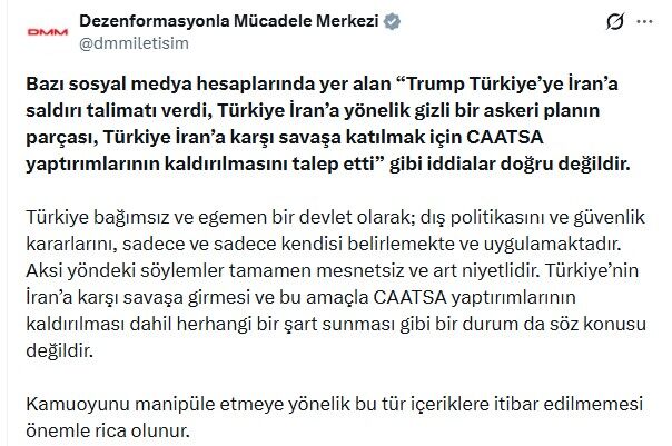 Sosyal medyadan yapılan açıklamada, “Bazı sosyal medya hesaplarında yer alan ‘Trump Türkiye’ye İran’a saldırı talimatı verdi, Türkiye İran’a yönelik gizli bir askeri planın parçası, Türkiye İran’a karşı savaşa katılmak için CAATSA yaptırımlarının kaldırılmasını talep etti’ gibi iddialar doğru değildir. Türkiye bağımsız ve egemen bir devlet olarak; dış politikasını ve güvenlik kararlarını, sadece ve sadece kendisi belirlemekte ve uygulamaktadır. Aksi yöndeki söylemler tamamen mesnetsiz ve art niyetlidir. Türkiye’nin İran’a karşı savaşa girmesi ve bu amaçla CAATSA yaptırımlarının kaldırılması dahil herhangi bir şart sunması gibi bir durum da söz konusu değildir. Kamuoyunu manipüle etmeye yönelik bu tür içeriklere itibar edilmemesi önemle rica olunur” ifadeleri yer aldı.