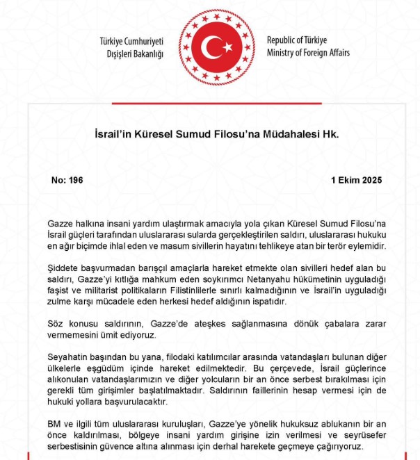 Türk Dışişleri, “Gazze halkına insani yardım ulaştırmak amacıyla yola çıkan Küresel Sumud Filosu’na İsrail güçleri tarafından uluslararası sularda gerçekleştirilen saldırı, uluslararası hukuku en ağır biçimde ihlal eden ve masum sivillerin hayatını tehlikeye atan bir terör eylemidir." denildi.