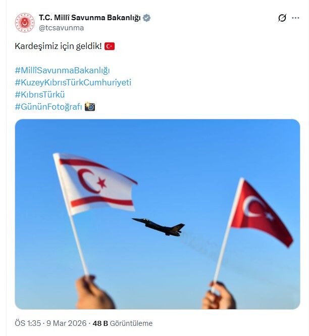 MSB, sosyal medya hesabından "Günün Fotoğrafı" etiketi ile yaptığı paylaşımda, gökyüzüne doğru kaldırılan KKTC ve Türk bayraklarının arasında uçan bir F-16'nın yer aldığı bir kareye yer verdi.