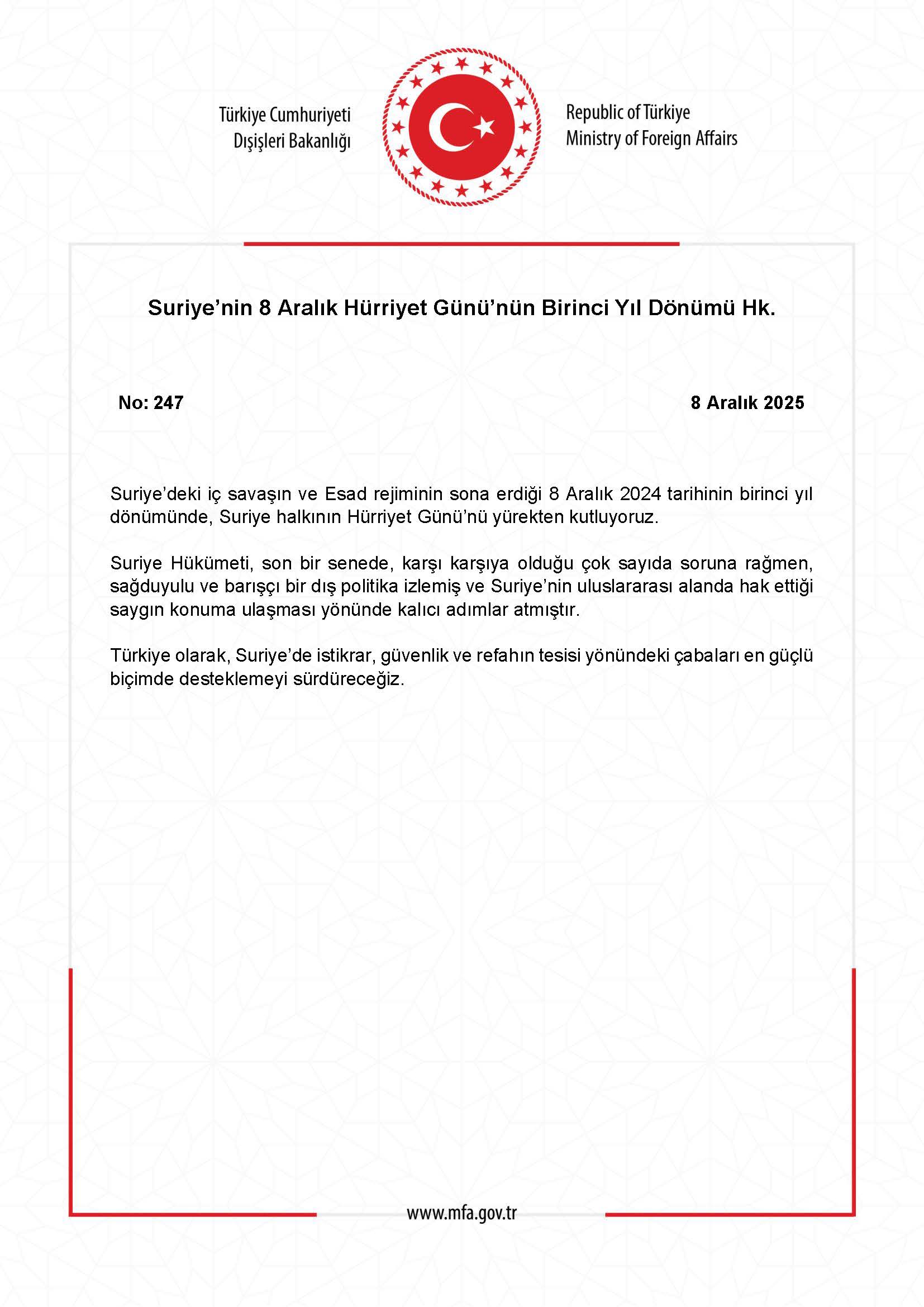 Bakanlık tarafından yapılan açıklamada, "Suriye’deki iç savaşın ve Esad rejiminin sona erdiği 8 Aralık 2024 tarihinin birinci yıl dönümünü, Suriye halkının Hürriyet Günü’nü yürekten kutluyoruz. Suriye Hükümeti, son bir senede, karşı karşıya olduğu çok sayıda soruna rağmen, sağduyulu ve barışçı bir dış politika izlemiş ve Suriye’nin uluslararası alanda hak ettiği saygın konuma ulaşması yönünde kalıcı adımlar atmıştır. Türkiye olarak, Suriye’de istikrar, güvenlik ve refahın tesisi yönündeki çabaları en güçlü biçimde desteklemeyi sürdüreceğiz" ifadelerini kullandı.