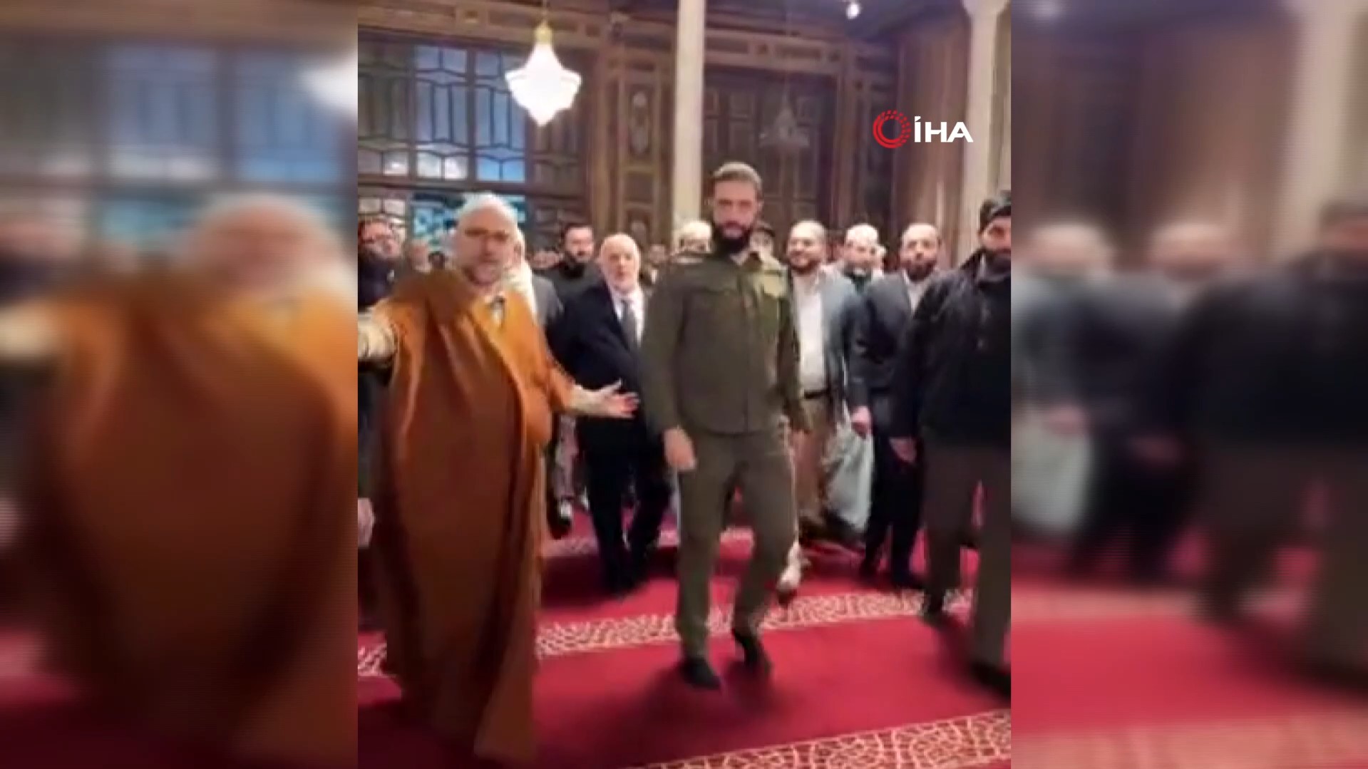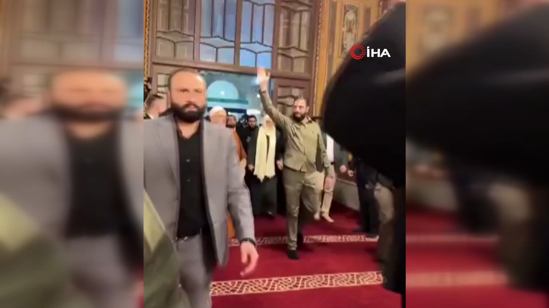 Geçen yıl Şam'a girdiği askeri kıyafetle camiye gelen Şara'ya, Dışişleri Esad Hasan Şeybani'nin de bulunduğu bazı bakanlar da eşlik etti.