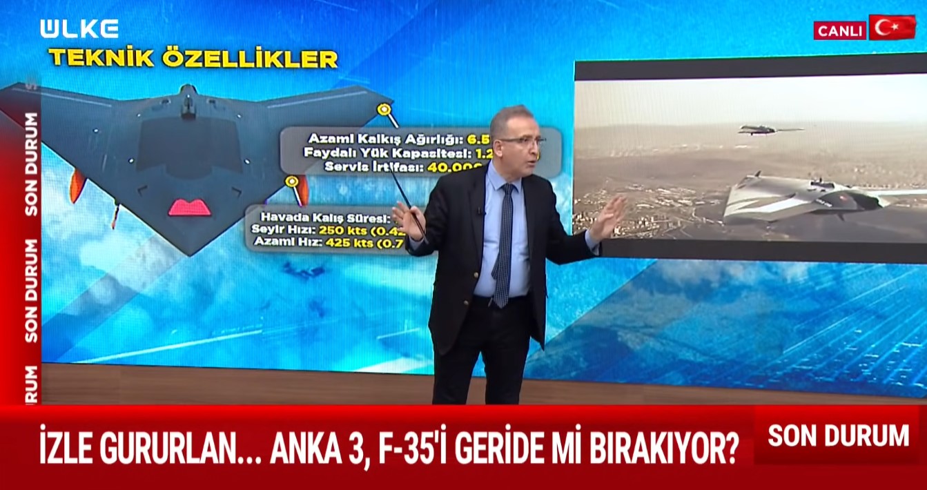 ANKA 3, F-35’i 60 km’den görüyor, F-35 ise ANKA 3’ü 40 km’den görebiliyor. 20 km’lik fark ise Anka 3’ün avantajıdır. ANKA 3’teki bu özellik hem yapısı ve üzerindeki radarından kaynaklıdır. Dolayısıyla havdan havaya GÖKDOĞAN füzesi ile ANKA 3, F-35’e daha erken ateş eder. Yani ANKA 3 vurur. Dikkat edin içinde bir insan olan F-35 ile insansız savaş uçağı ANKA 3’ü karşılaştırıyoruz. Hangi ülke F-35 içindeki pilotunu, insansız savaş uçağımız ANKA 3’e feda edebilir. Yok böyle bir şey. ABD bunları bildiği için Suriye’de PKK’yı bize verdiler. Neden? Ne ABD ne de İsrail, Türkiye’ye diş geçirebilecek, silahla, teknolojiyle vs. tehdit edecek durumda değil.