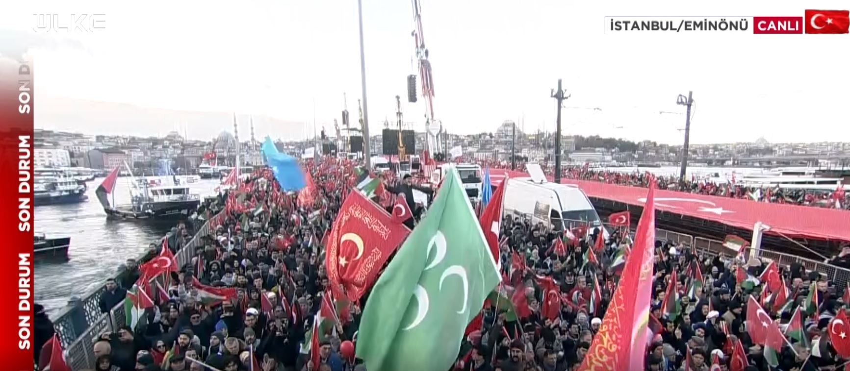 "Bu soykırım yalnızca on binlerce ton bombayla yapılmıyor. Bu soykırım açlıkla yapılıyor bu soykırım susuzluk yapılıyor soğukla yapılıyor. İnsani yardımların engellenmesi ile yapılıyor. Bugün Filistin’de kış şartlarında derme çatma çadırların içinde her türlü imkandan yoksun insanlar var. Ve bu insanlara ulaşabilecek yardımı bilerek isteyerek ve hatta zevk alarak engelleyen zalim bir düzen var. Bu kadar alçalmayı mümkün kılan bir zihniyetin başındaki Netanyahu eşkıyasını Rabbimiz Kahhâr ismi şerifi ile kahru perişan eylesin. Sivillerin hedef alınması, orantısız güç kullanılması açık savaş suç unsurudur. Bu suçlar merkezi kararlarla yönetilmektedir. Bunlar bir çatışma değildir, devlet gücü ile inşa edilen modern bir yok etme siyasetidir. Bir ayrımı muhakkak yapmalıyız. Müslüman Türk milleti olarak bugün Galata Köprüsü’nde toplanmış olan insanlık ittifakının üyeleri olarak meselemiz bir dinle değil meselemiz bir halkla değil peygamberimizin bize örneklerinin bizi getirdiği noktada o günden bugüne hiçbir Müslüman hükümdar yoktur ki milletini şu dinin mensubu bu dinin mensubu diye ayırt etsin. Gazze'nin inşası İsrail'in vereceği tazminatla yapılmalıdır. İsrail tarafından silahlandırılan yerleşimciler, Batı Şeria'da Filistinlileri hedef almaktadır ve bu birbirinden kopuk değildir. Filistin'in toprak bütünlüğü tanınmadan mücadelemize ara vermeyeceğiz.