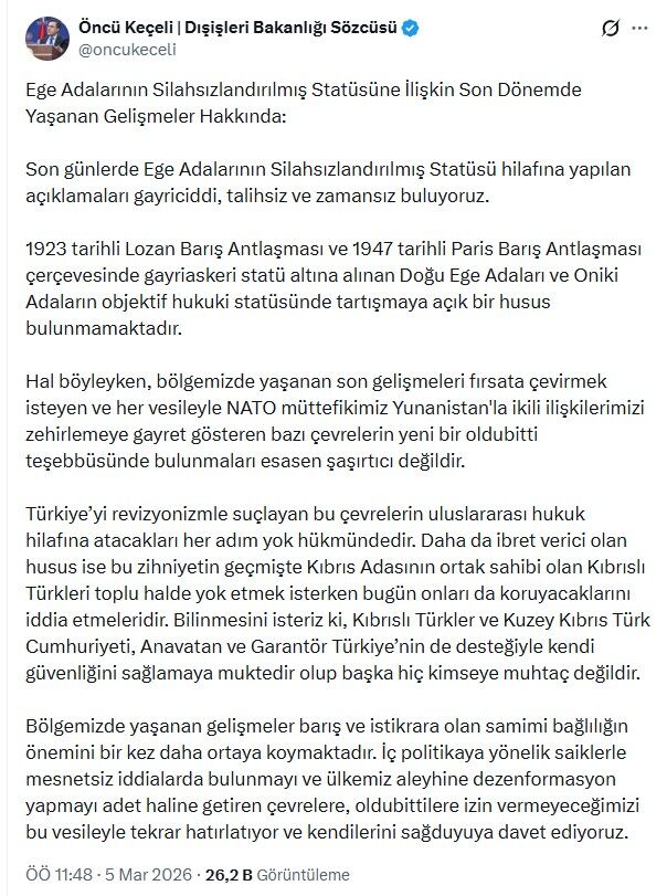 Keçeli, "Son günlerde Ege Adalarının Silahsızlandırılmış Statüsü hilafına yapılan açıklamaları gayriciddi, talihsiz ve zamansız buluyoruz" dedi.