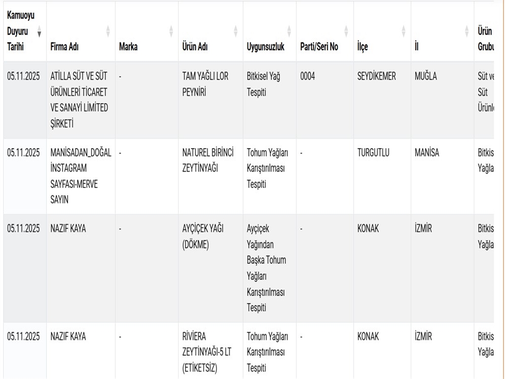 Listede zeytinyağı, ayçiçek yağı ve lor peyniri gibi ürünler yer aldı.